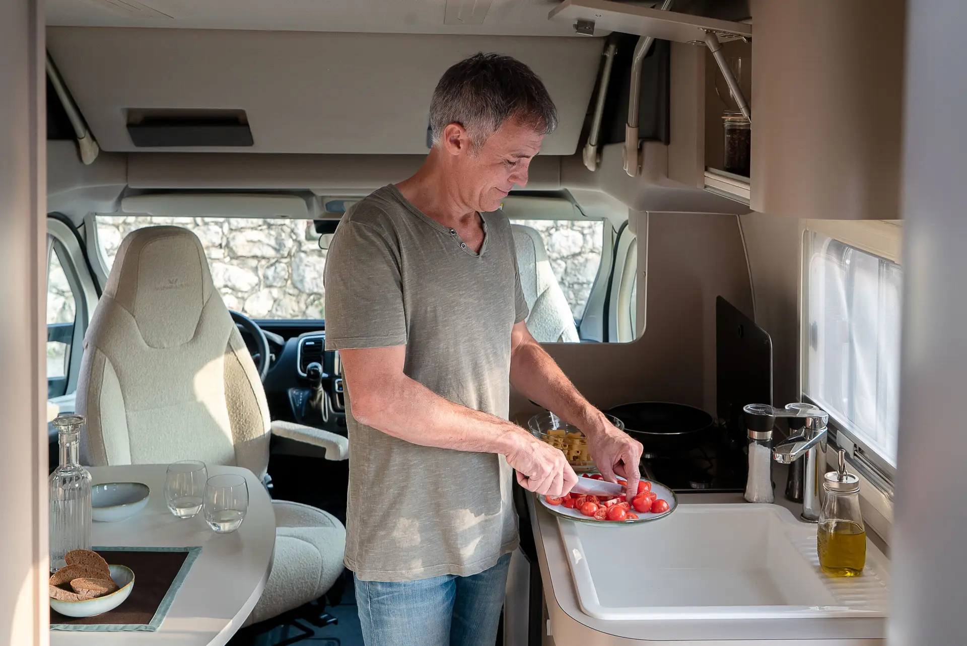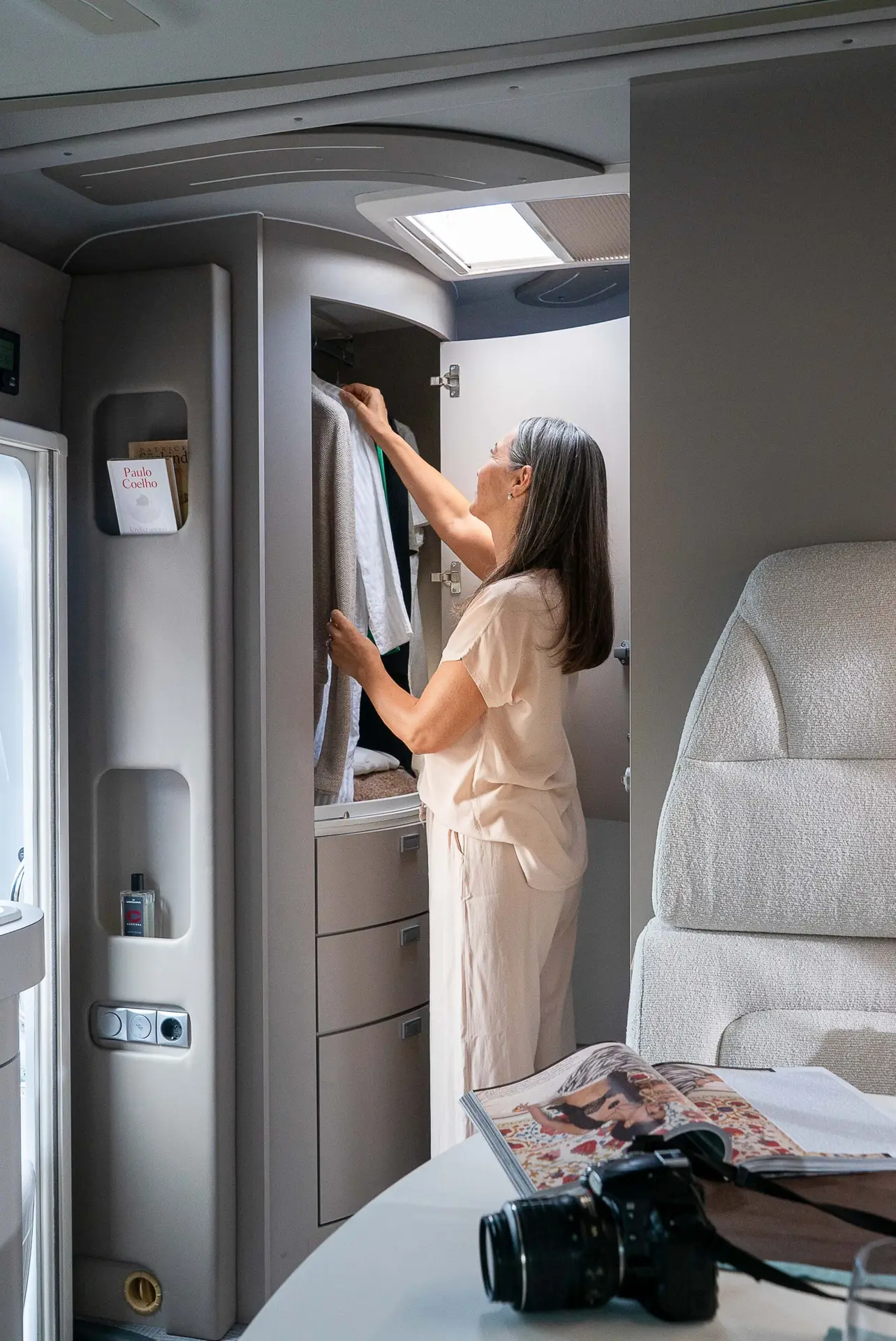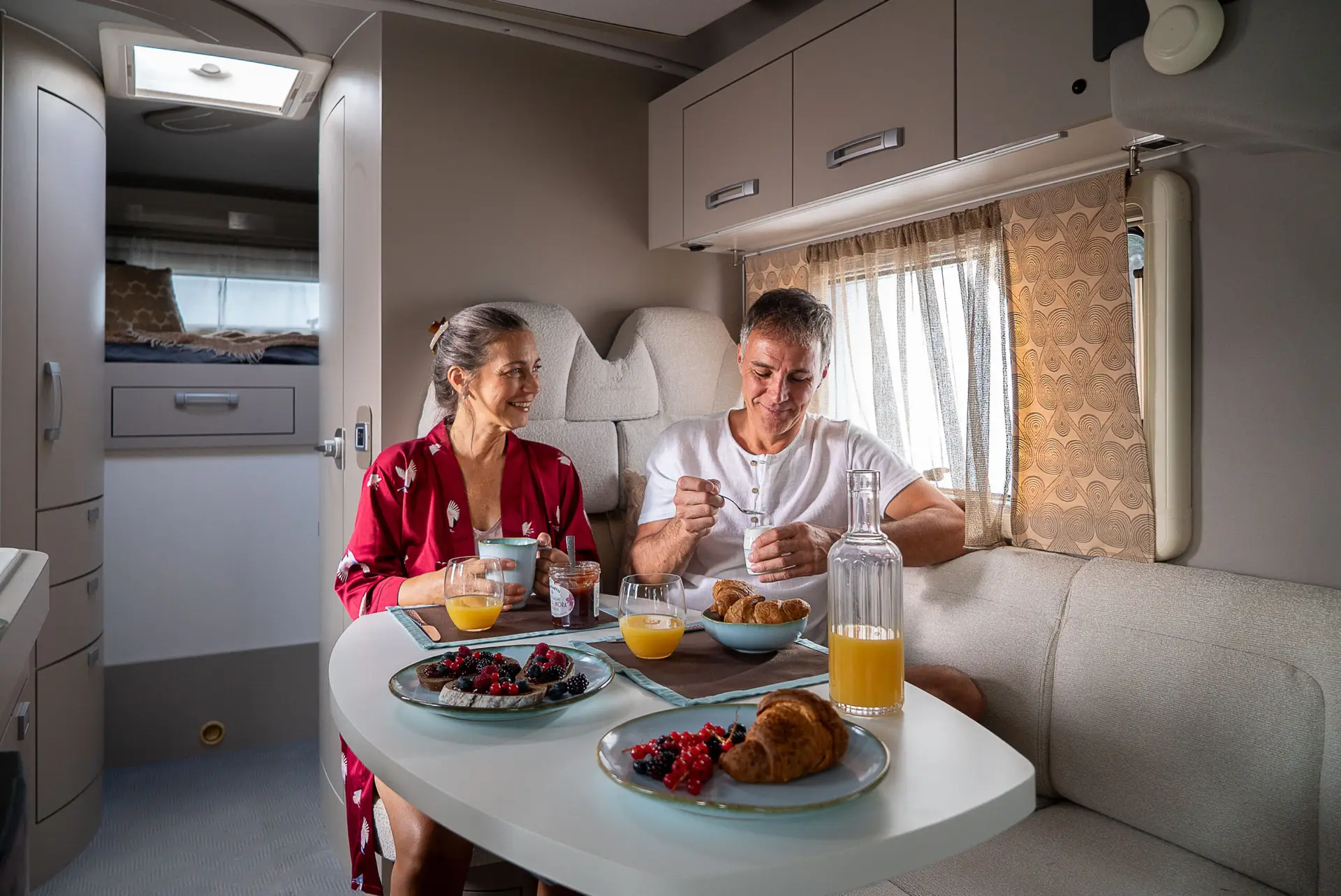 - Spacious Living Area: Swivel captain chairs and a 360° rotating oval table